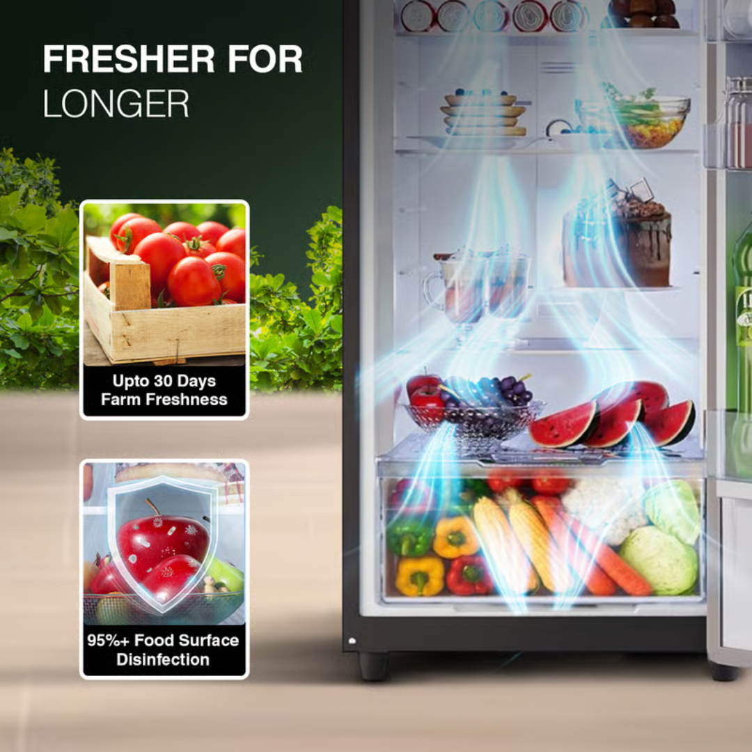 Storage Description : Fresh food capacity : 194 L | Freezer capacity : 50 L | Shelf type : Toughened glass shelf | Large aqua space for 2 L bottles Special Feature: Advanced Appliance with classy wood finish; Patended cool shower technology: shelves with inbuilt air vents for uniform 360° cooling, even when the fridge is heavily loaded. Up to 30 Days farm freshness: Keep your fruits and vegetables Farm fresh up to 30 days with the help of Cool Balance Technology and Moisture control technology; 95% food surface disinfection with Nano shield technology.
