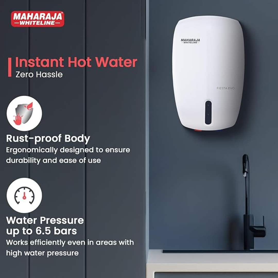 • Instant Water Heat: Maharaja Whiteline Fiesta Evo heats the water instantly; the water remains warm for a longer period with a high-grade copper element integrated in the heater.