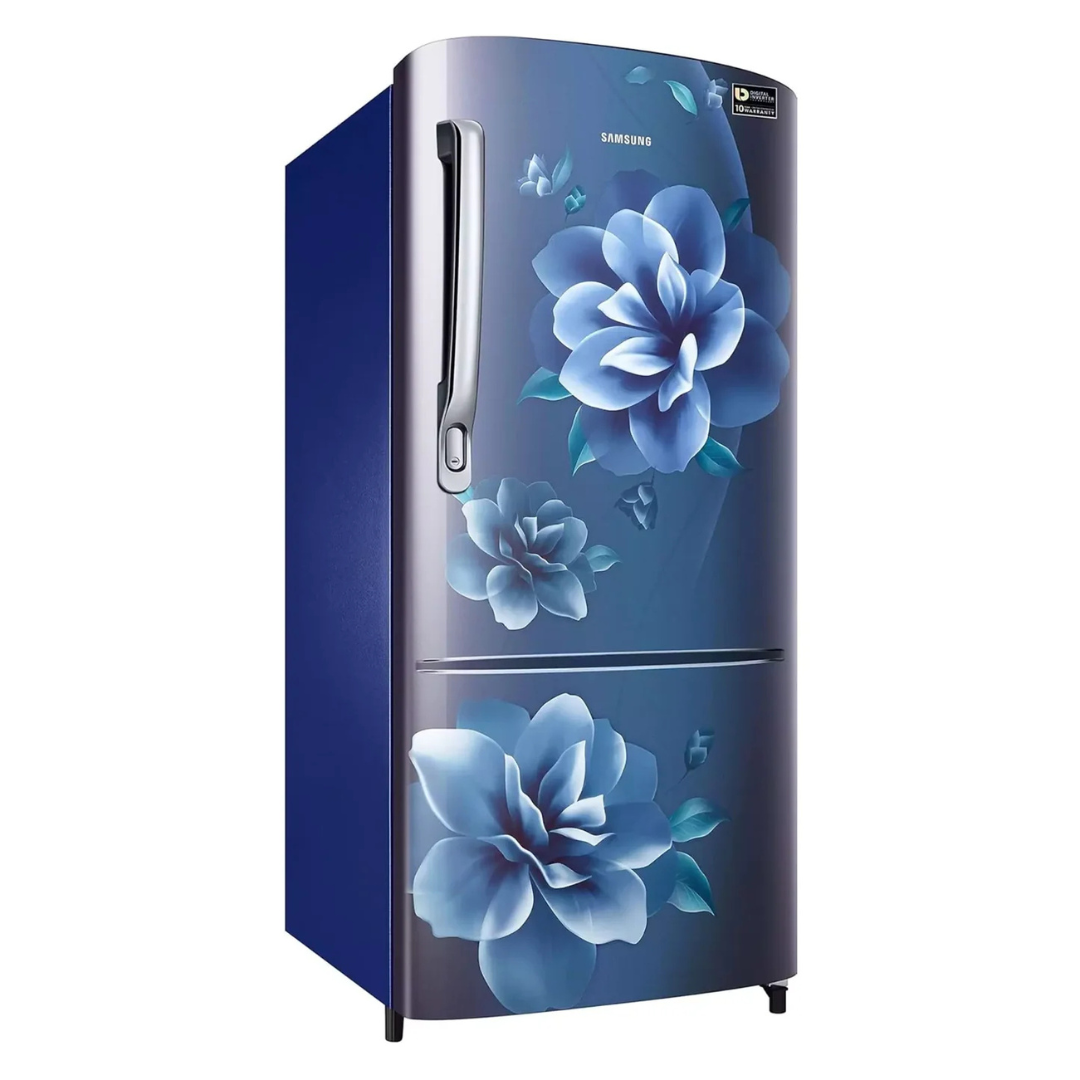 Stylish Design – Single Door Refrigerator with Modern Camellia Blue pattern.