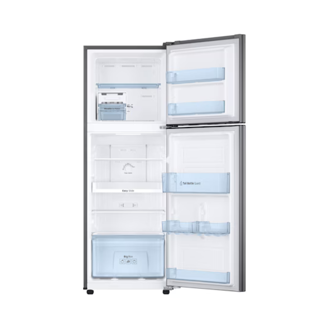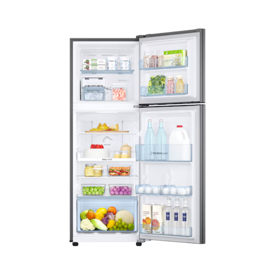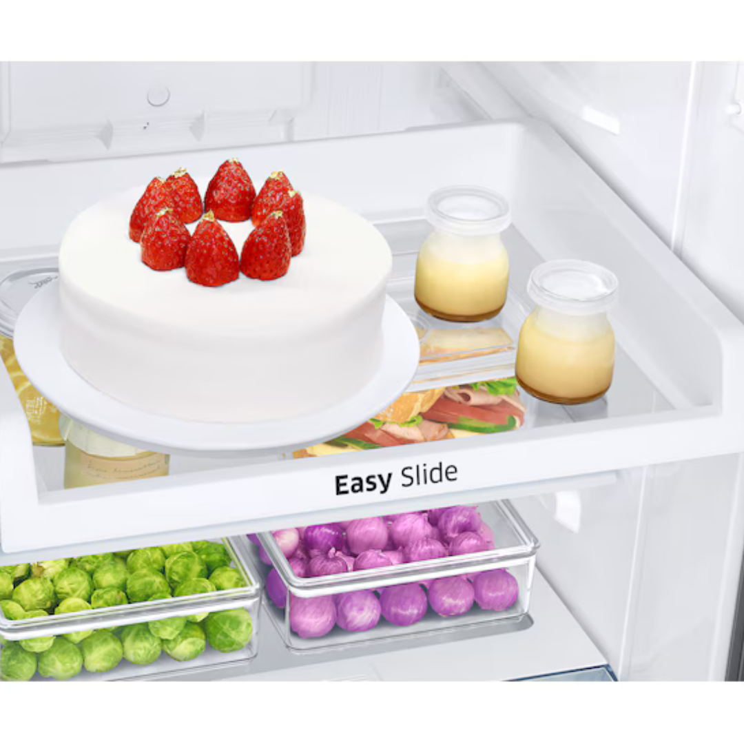 Premium Interior – 3 toughened glass shelves, easy-slide shelf, 1 vegetable drawer, 4 door pockets, LED lighting.