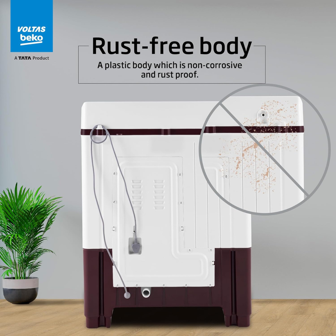 Drum / Pulsator type & Body material: Plastic body, Special Pulsator & Plastic drum providing durability, rust resistance, and a gentle surface for clothes during washing